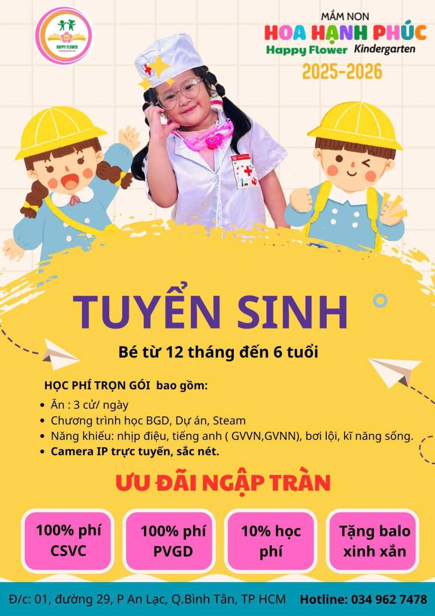Chào mừng ba mẹ và các bé đến với Mầm non Hoa Hạnh Phúc – nơi mỗi ngày đến lớp là một hành trình khám phá đầy ắp tiếng cười và tình yêu thương.
